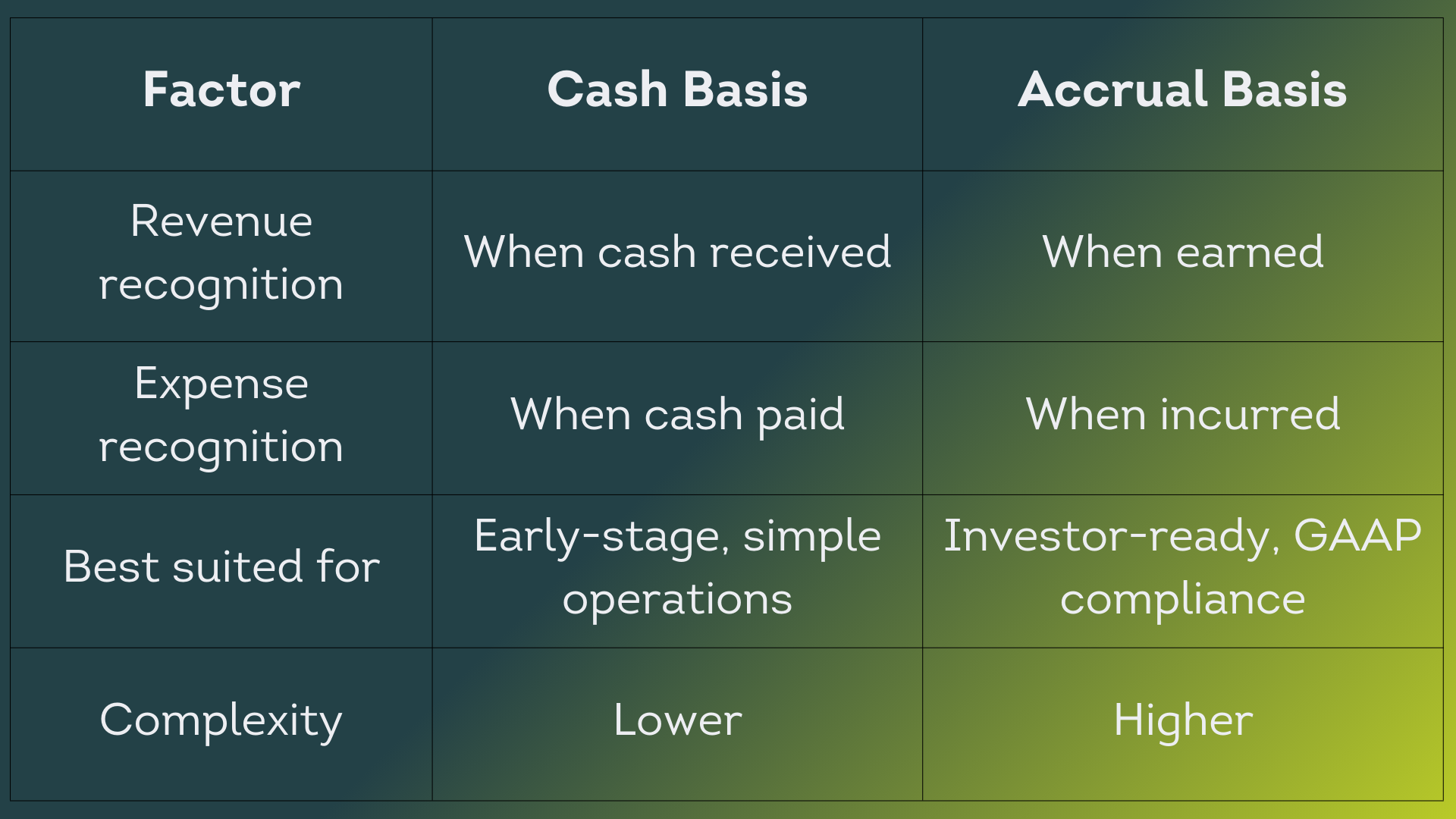 If you're planning to raise institutional capital, accrual accounting isn't optional. Investors expect it. Converting from cash to accrual mid-fundraise creates delays and potential red flags during due diligence, so starting with accrual from the beginning saves headaches later.